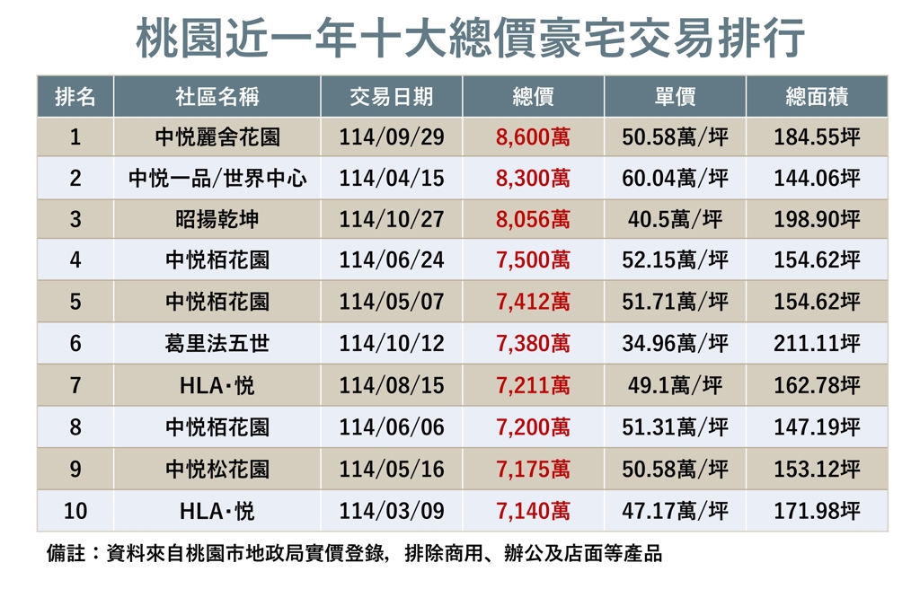 觀察2025年至今桃園十大總價豪宅排行榜,數據精確反映高端客層對「品牌」與「規格」的品牌忠誠度,榜單首位由「中悦麗舍花園」以8,600萬元奪冠,緊隨其後的「中悦一品」更以每坪60.04萬元立下成屋豪宅單價天花板,從前十大榜單分析,中悦建設機構的作品即佔據過半席次,顯見在市場產品普遍縮減坪數的趨勢下,具備品牌口碑且堅守百坪豪奢格局的作品,仍是高端買方心中真正好住,且具備傳承價值的核心資產。